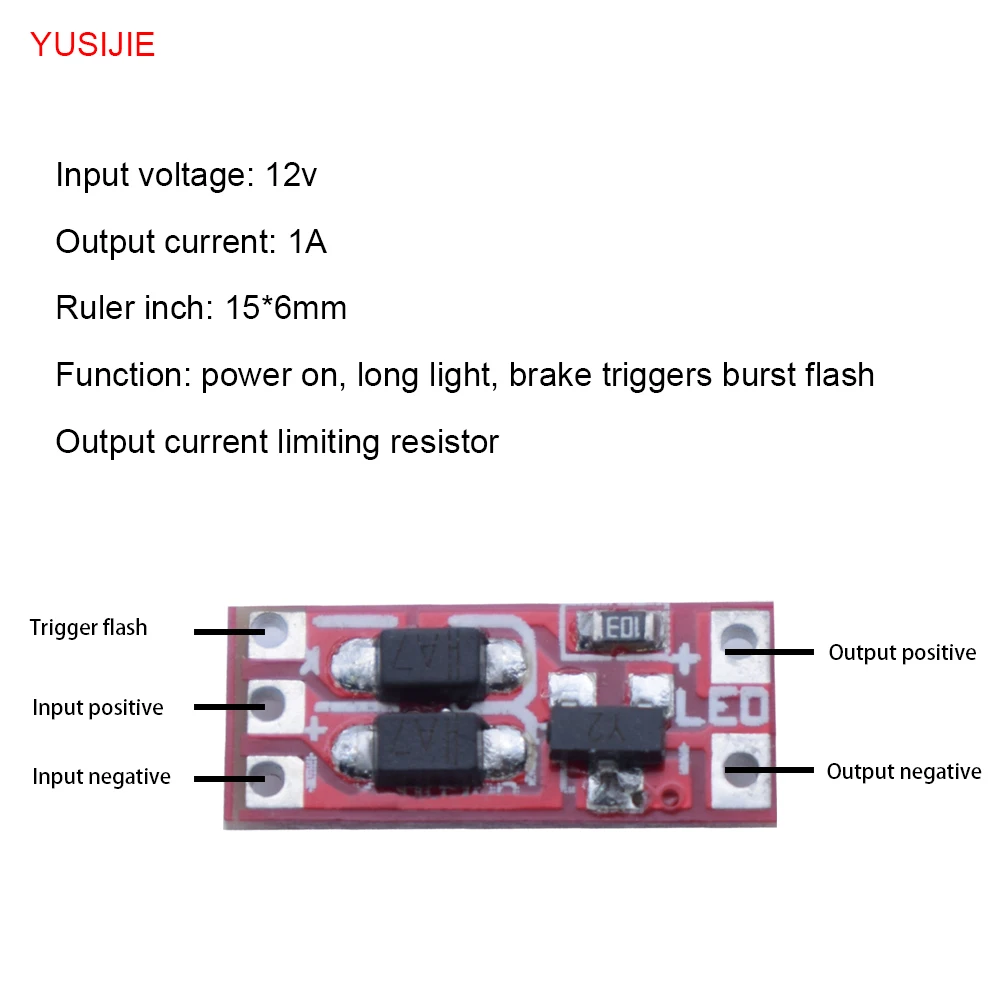 Input voltage: 12v Output current: 1A Ruler inch:15*6mm Function: power on, long light, brake triggers burst flashOutput current limiting resistor |