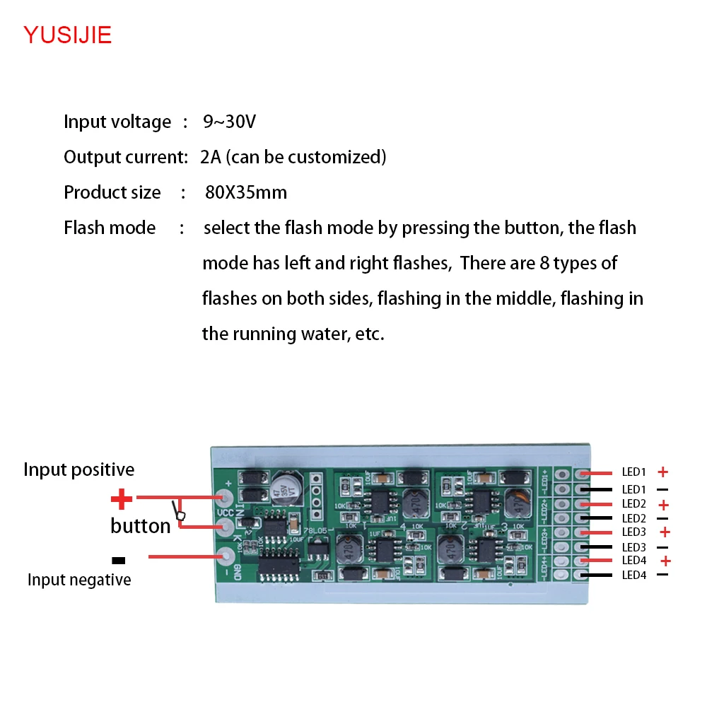 Input voltage :9~30V Output current: 2A(can be customized) 80X35mmProduct size: Flash mode:select the flash mode by pressing the button, the flashmode has left and right flashes, There are 8 types offlashes on both sides, flashing in the middle, flashing inthe running water, etc. |