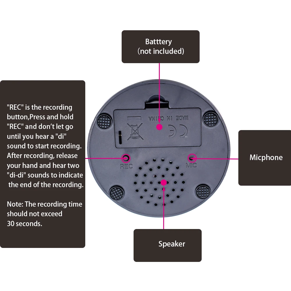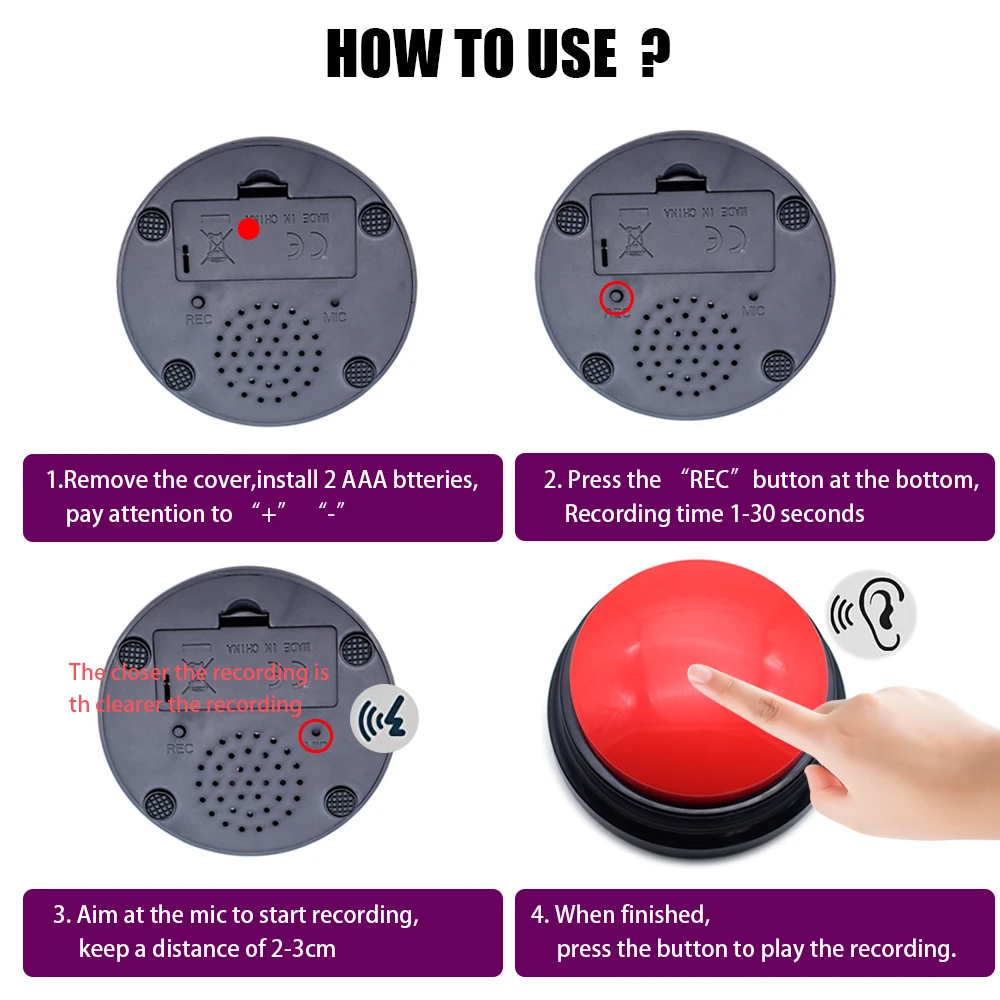 Step 2 Press and hold the bottom "REC" buton. When you heara single "beep". record a message of 30 seconds or less. When you' re done, release the "REC".A double beep -beep" signifes a successful recording- For best sound quality, keep the audio source about 2-3mm from the MIC. Step 3 Short press the top button to playback the recording. Recordable Talking Button Child Interactive toy Phonograph Answer Buzzers Portable Recording Sound Button Party Noise Makers This button can record your own voice and you can record after long pressing.It can also be used as a parent-child interactive toy, a children's language education toy, or as a phonograph between family, company and friends. Features: Can be used as a parent-child interactive toy. Can be used as a children's language education toy. Can be used as a phonograph between family, company and friends. Small size, easy to carry and easy to use. Different colors for your choice. the recording time is less than 30 seconds. Specifications: Item type: Button Material: ABS plastic Color: Blue, pink, green, orange(optional) Gender: Unisex Battery: 2 * AAA(not included) Volume: 70dB Package weight: 100g