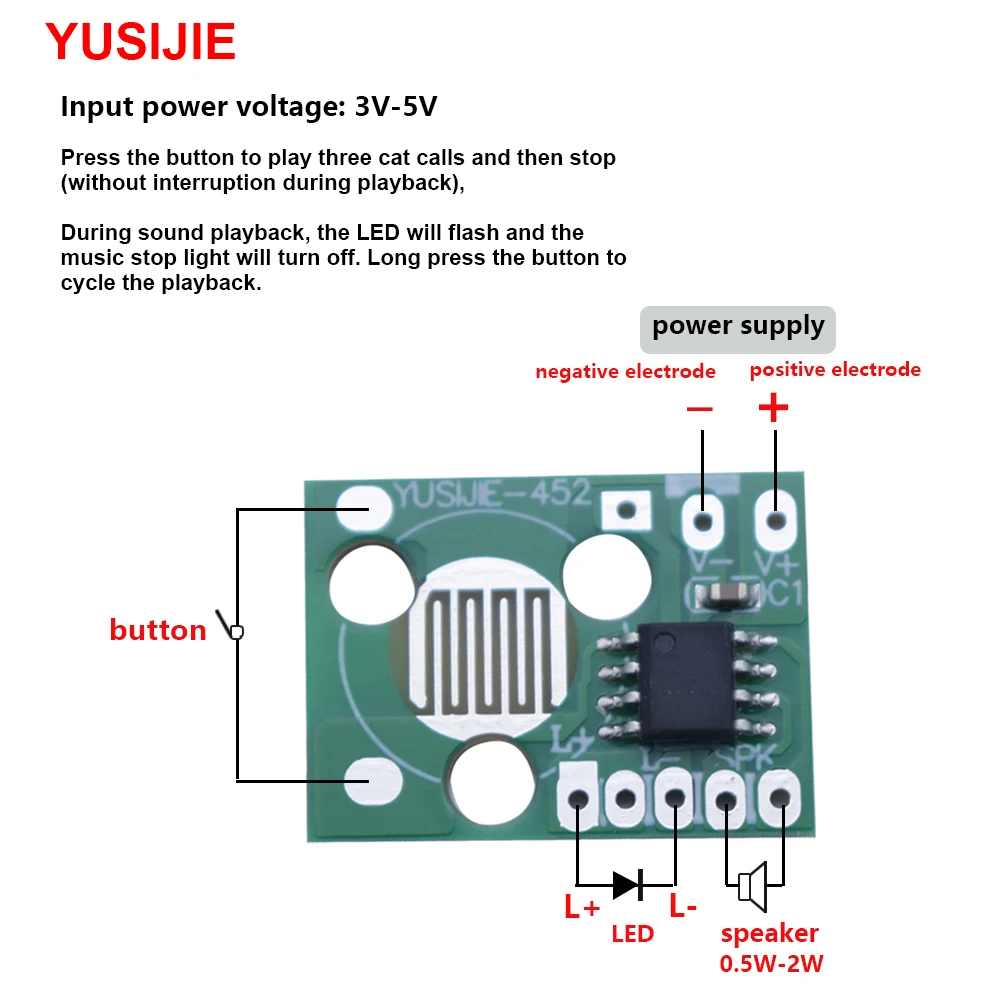 Product Description YSJ-452 cat meow sound control board meow sound chip DIY with led animal sound module Product model: YUSIJIE-452